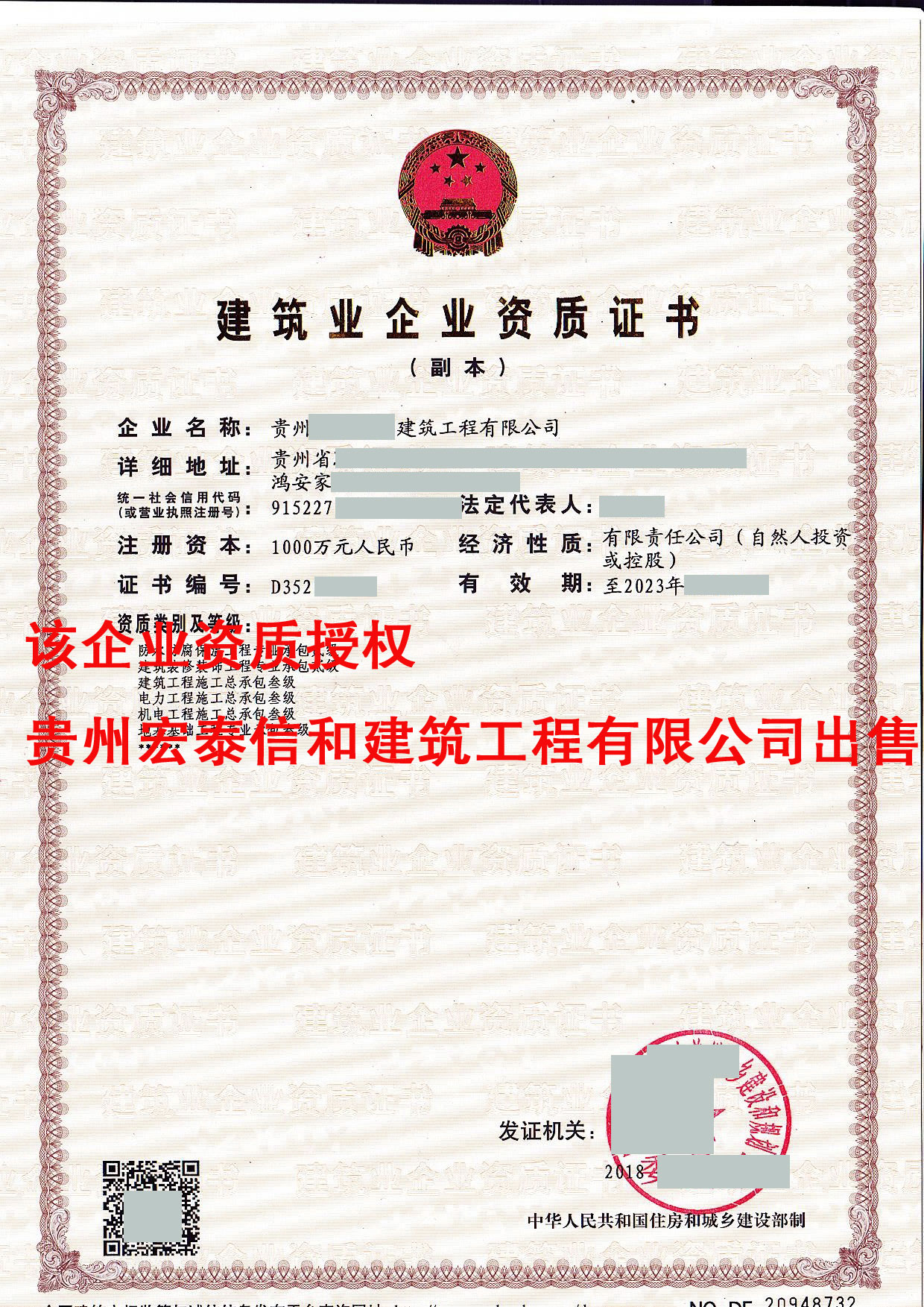 | 施工专业承包资质 | 建筑装修装饰工程 | 二级 | 2023 年 | 住建部 |